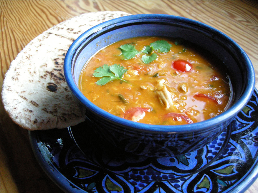 - Saus: Ui en knoflook zachtjes bakken in de olie. Paprika en tomaat toevoegen met kruiderij, zout en wijn. Vijf minuten zachtjes onder deksel stoven met de aardappels erbij. De eieren even laten meedoen. Op ’t allerlaatst met verse tijm en korianderblad bestrooien.