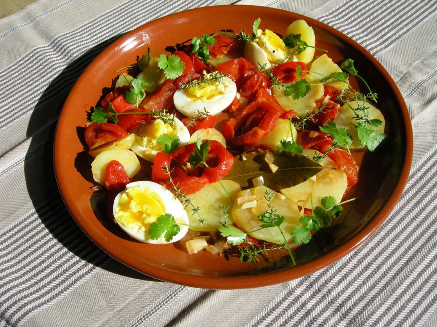 - Saus: Ui en knoflook zachtjes bakken in de olie. Paprika en tomaat toevoegen met kruiderij, zout en wijn. Vijf minuten zachtjes onder deksel stoven met de aardappels erbij. De eieren even laten meedoen. Op ’t allerlaatst met verse tijm en korianderblad bestrooien.